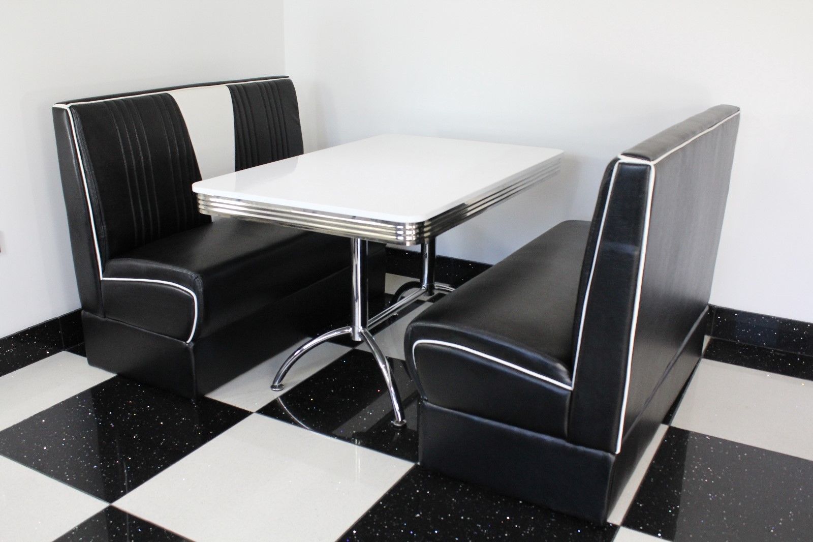 Black Nashville Booth Diner Set SECONDS – The retro-look black booths with a contrasting white panel are fully upholstered with faux leather, padded and come with a retro style white topped booth table, with ribbed edging for durability. The booths may have 1-2 small holes/marks on the faux leather, hence the price of the set. The table may have a very small mark/dent on it.